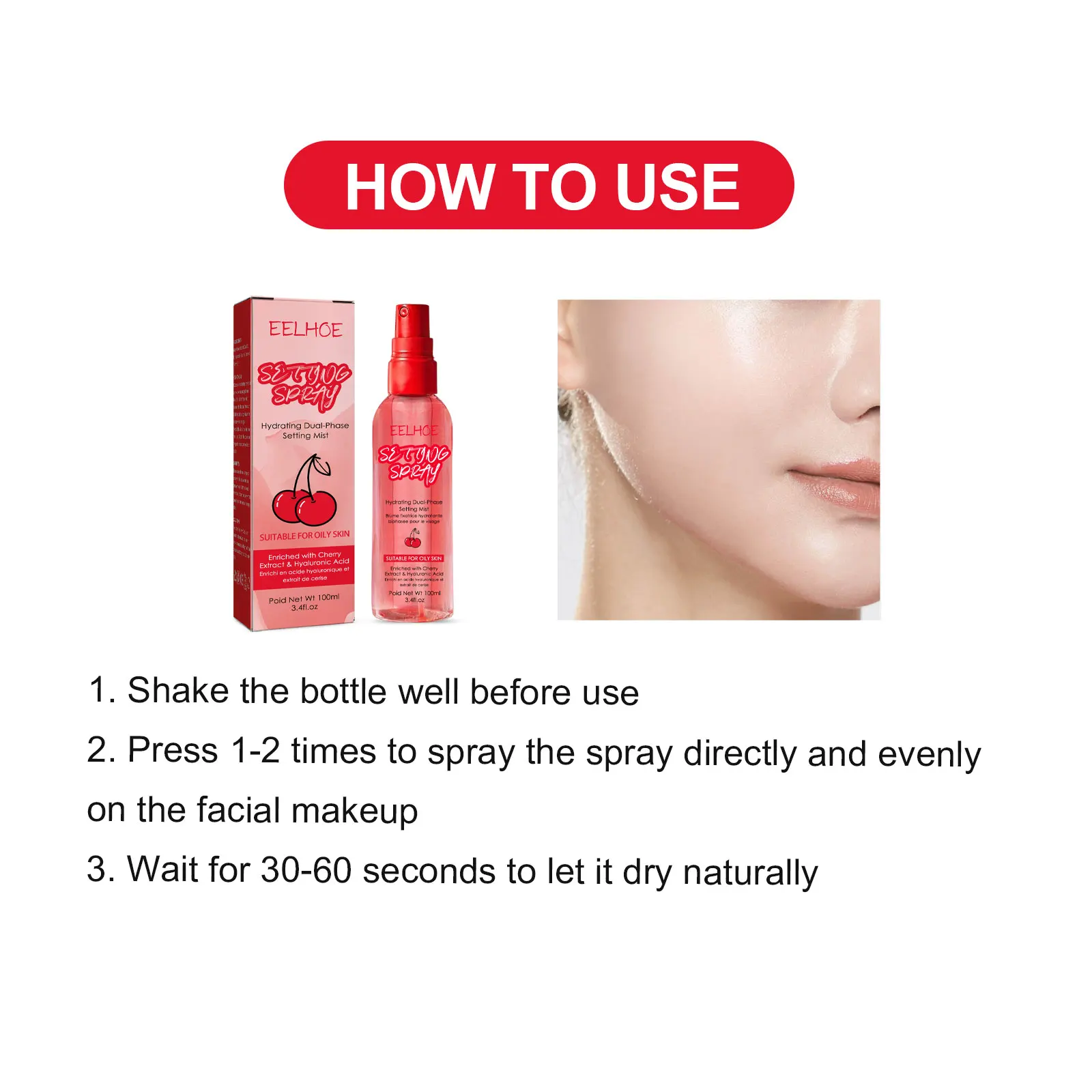 3. Wait for 30-60 seconds for it to dry naturally. This superfine dual skin spray can immediately add moisture to your skin, help lock and refresh your makeup. The lightweight formula gives the skin a radiant and long-lasting freshness throughout the day.